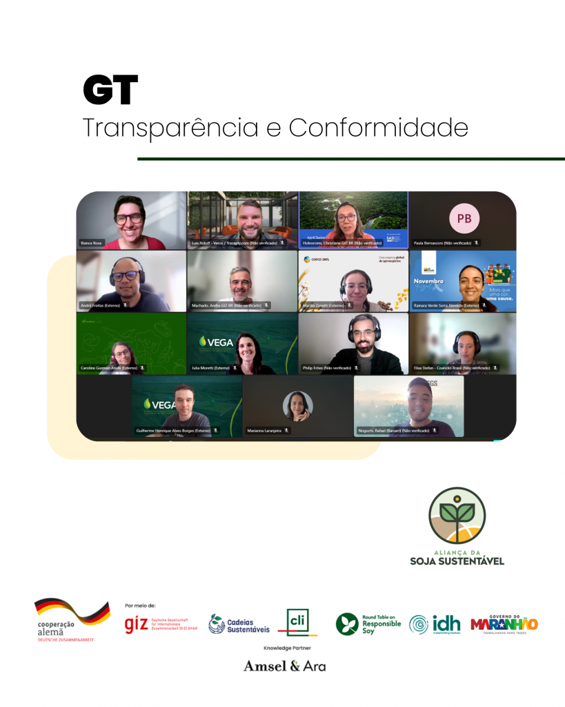 No GT de Transparência e Conformidade, sob coordenação da GIZ Brasil, a Coalizão Brasil Clima, Florestas e Agricultura compartilhou atualizações sobre o estudo Rastreabilidade da Soja no Brasil. O WWF-Brasil apresentou os avanços do SIFMA – Selo Verde e ações relacionadas à COP30. As empresas-membro Vega Monitoramento e Veros apresentaram soluções aplicadas à rastreabilidade e à conformidade socioambiental.