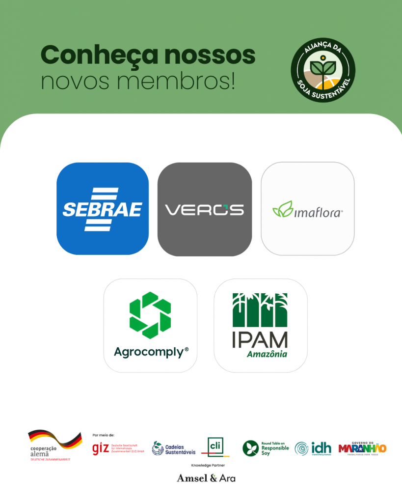 Com alegria, anunciamos a chegada de cinco instituições que agora fazem parte da Aliança da Soja Sustentável: Sebrae Maranhão, Veros, Imaflora, Agrocomply e IPAM Amazônia