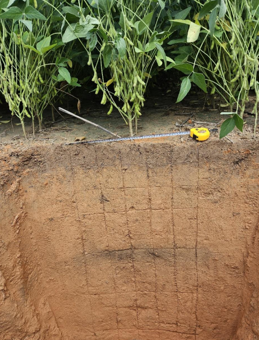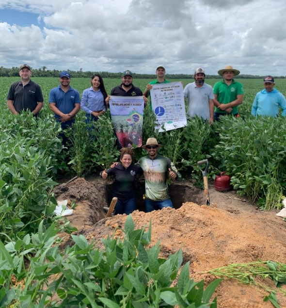 Perfil de solo em trincheira, executado durante o Dia de Campo na Fazenda São Camilo, em Milagres do Maranhão, safra 2024/2025.