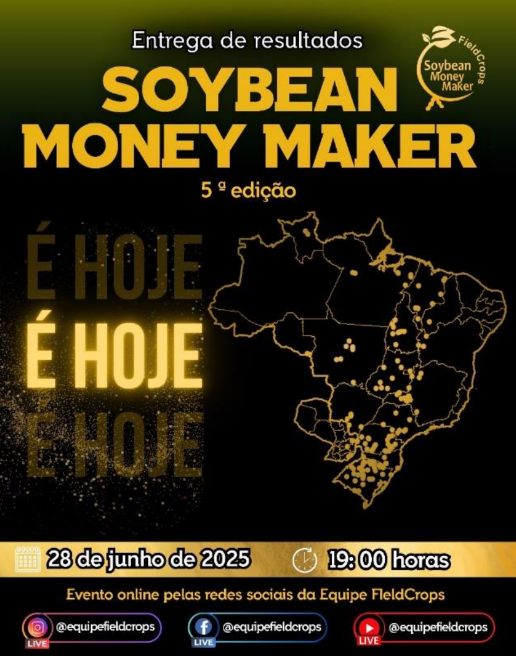 Folder de divulgação da apresentação dos resultados do Soybean Money Maker – safra 2024/2025, promovida pela equipe FieldCrops em 28 de junho de 2025.