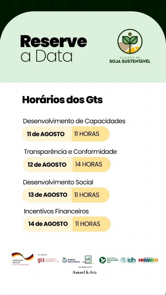 A Aliança da Soja Sustentável te convida para as reuniões dos Grupos de Trabalho (GTs) de agosto. Sua participação é fundamental para avançarmos em práticas mais sustentáveis e inovadoras no setor!